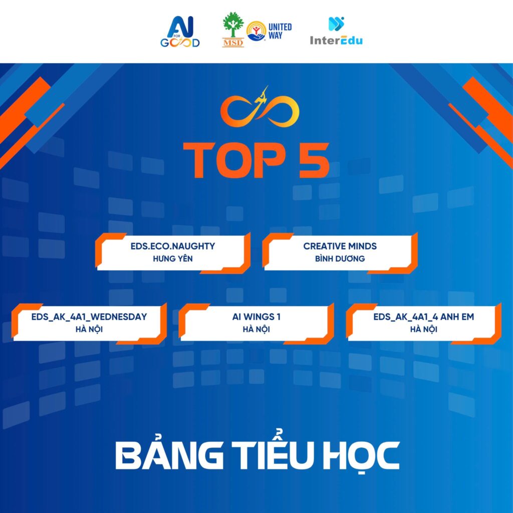 Từ hơn 450 bài dự thi đến từ 33 tỉnh thành, các bạn đã xuất sắc lọt vào TOP 5 với những dự án được Ban Giám Khảo đánh giá cao nhất về sáng tạo, tính ứng dụng, và thông điệp tử tế – đúng tinh thần “AI vì cộng đồng”!