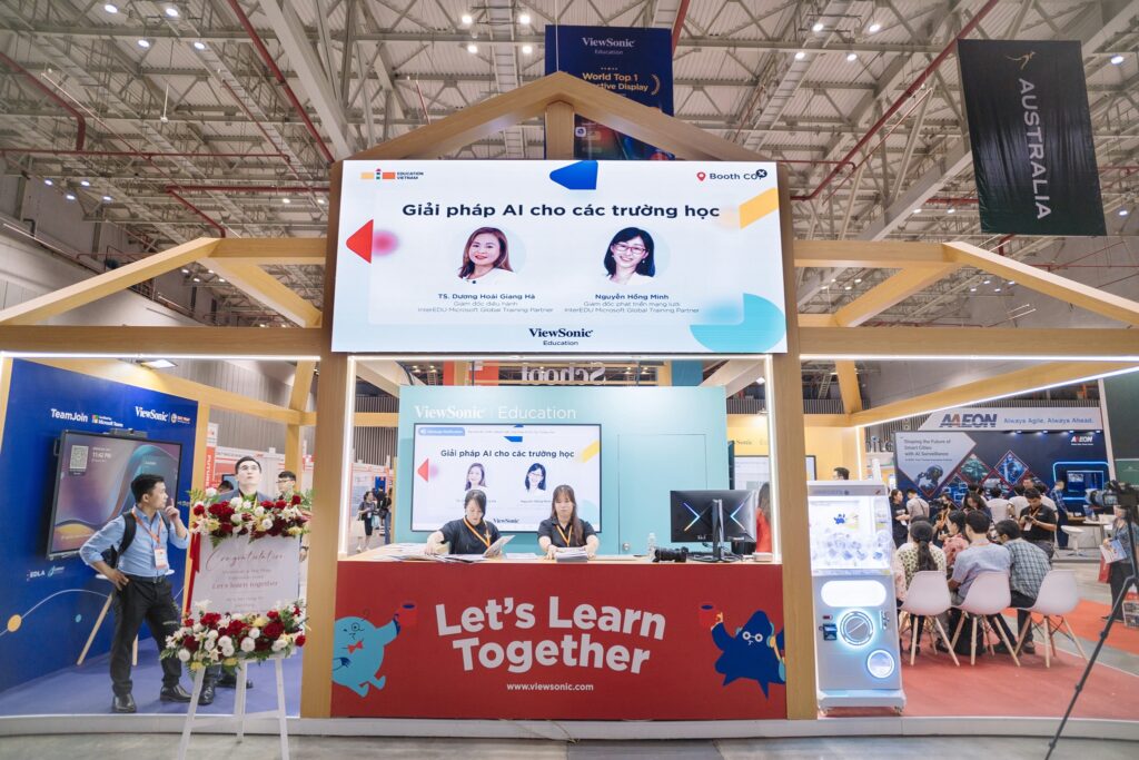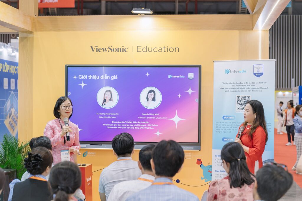 Cùng với đó, tại khu vực booth triển lãm của ViewSonic, các nội dung chia sẻ của TS. Dương Hoài Giang Hà và Bà Nguyễn Hồng Minh – Giám đốc phát triển mạng lưới InterEdu, Chuyên gia Giáo dục sáng tạo cấp cao Microsoft xung quanh đề tài “Giải pháp AI cho trường học” cũng thu hút đông đảo người tham gia.