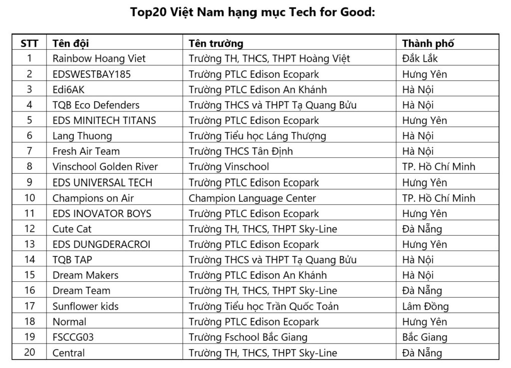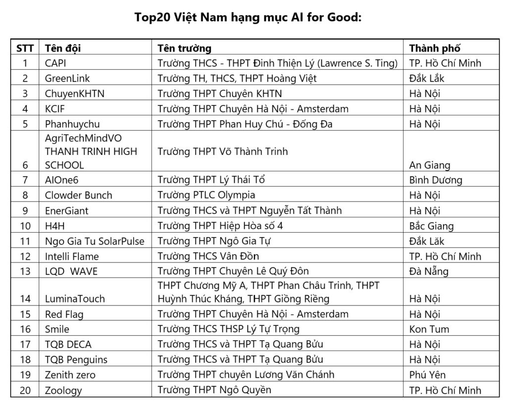 Đối với danh mục AI for Good, Việt Nam vinh dự có 2 đại diện lọt Top 10 toàn cầu, đội IntelliLex đến từ Trường TH, THCS, THPT Sky-Line Đà Nẵng và đội Milky Way đến từ trường TH, THCS, THPT Lê Quý Đôn – Quyết Thắng, Đồng Nai thuộc Tập đoàn Giáo dục IGC.