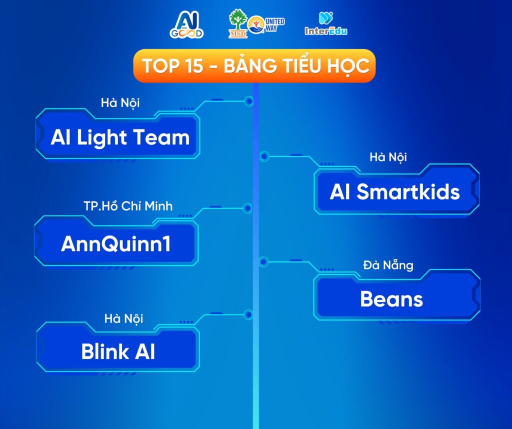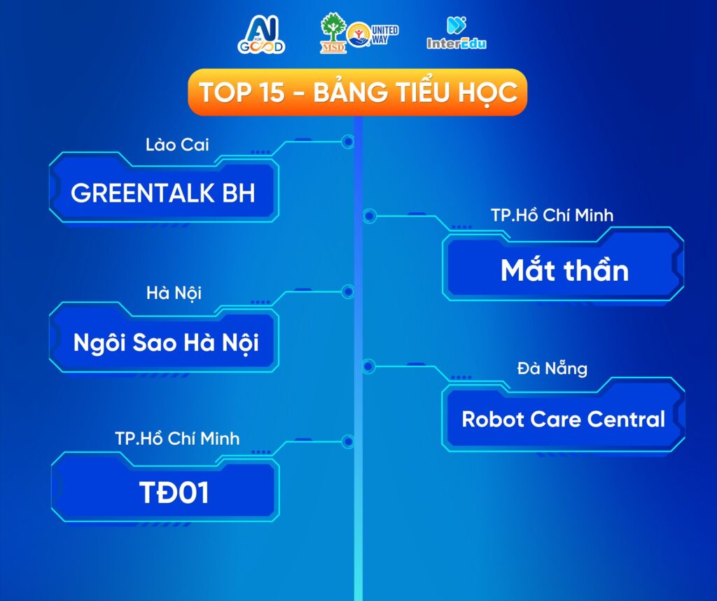 Xin chúc mừng các đội thi đã xuất sắc góp mặt trong TOP 15 bảng Tiểu học! Đây là thành quả xứng đáng cho sự sáng tạo và nỗ lực không ngừng trong suốt hành trình vừa qua. Chúc các bạn tiếp tục bứt phá và tỏa sáng ở chặng đường phía trước!
